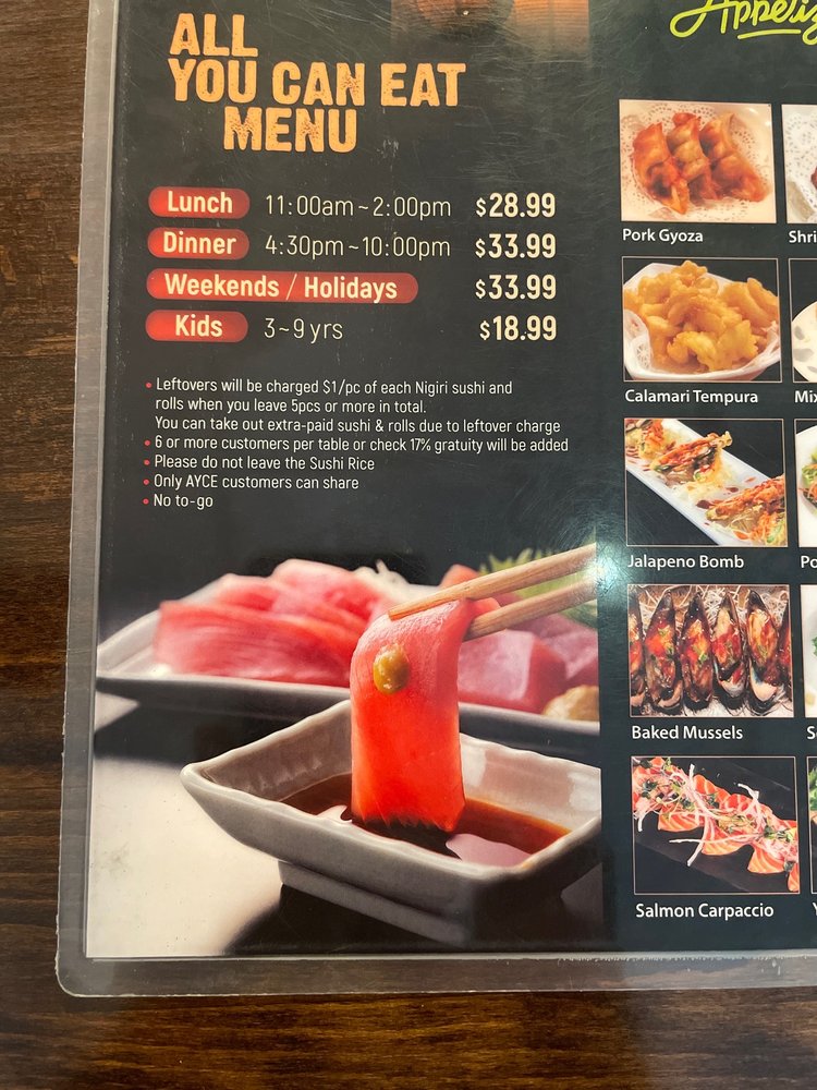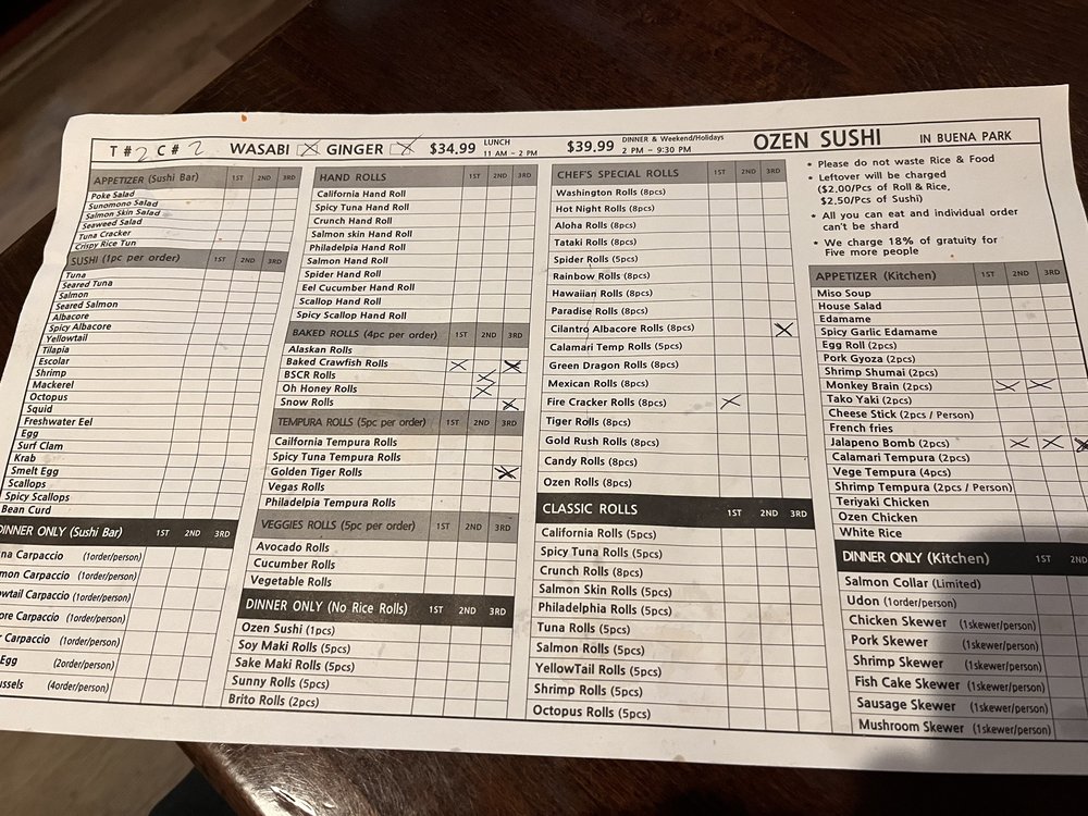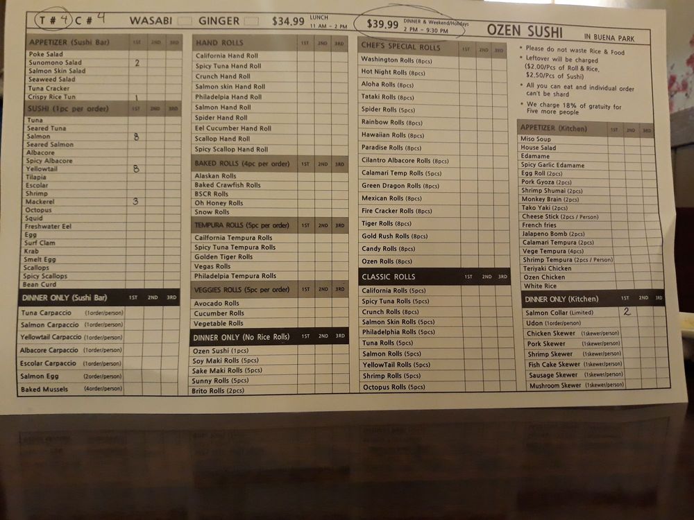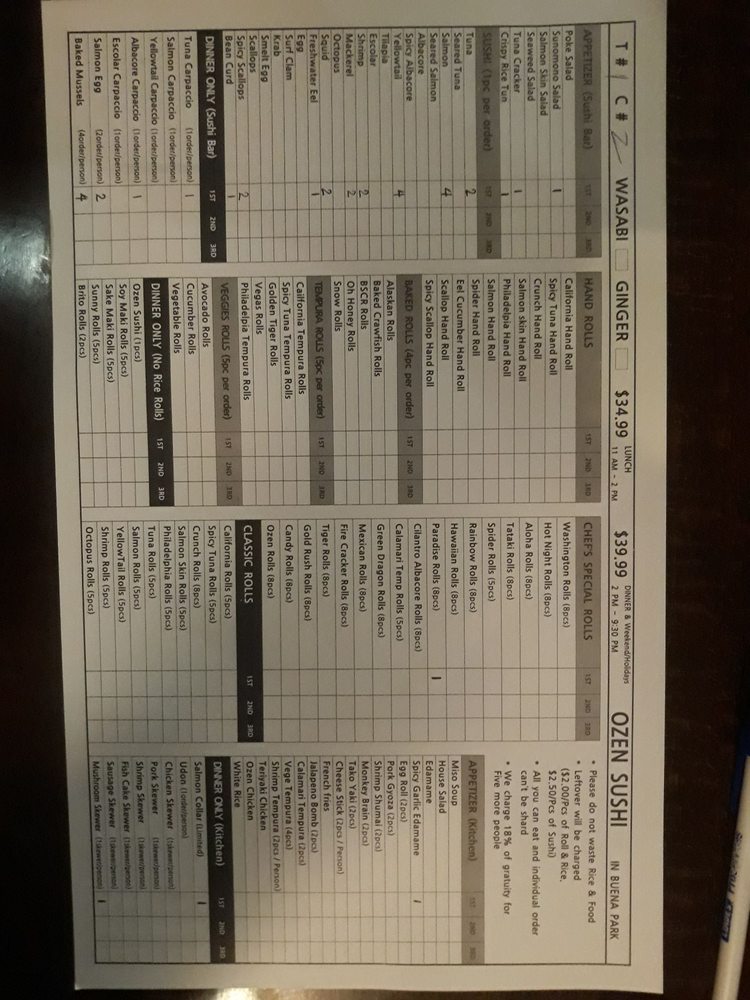 Introducing Ozen Sushi: located in Buena Park, CA, this casual yet quality spot offers a variety of options including Vegan and Limited Vegetarian choices. With a diverse menu, Ozen Sushi provides a range of fresh and delicious sushi dishes, catering to all preferences. Customers praise the quick service and friendly staff, making dining here a pleasant experience. The all-you-can-eat option is a standout feature, allowing you to sample a variety of rolls. Whether you're a sushi aficionado or a veggie lover, Ozen Sushi has something for everyone. Stop by for lunch or dinner, and indulge in top-notch sushi in a relaxed setting. Don't miss out on their late-night hours, offering a perfect solution for those midnight cravings. Overall, Ozen Sushi is a must-visit for sushi enthusiasts looking for a satisfying and enjoyable dining experience.